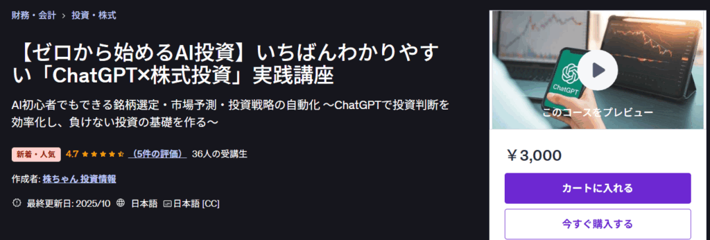 UdemyでChatGPT×株式投資活用講座を開設しています。