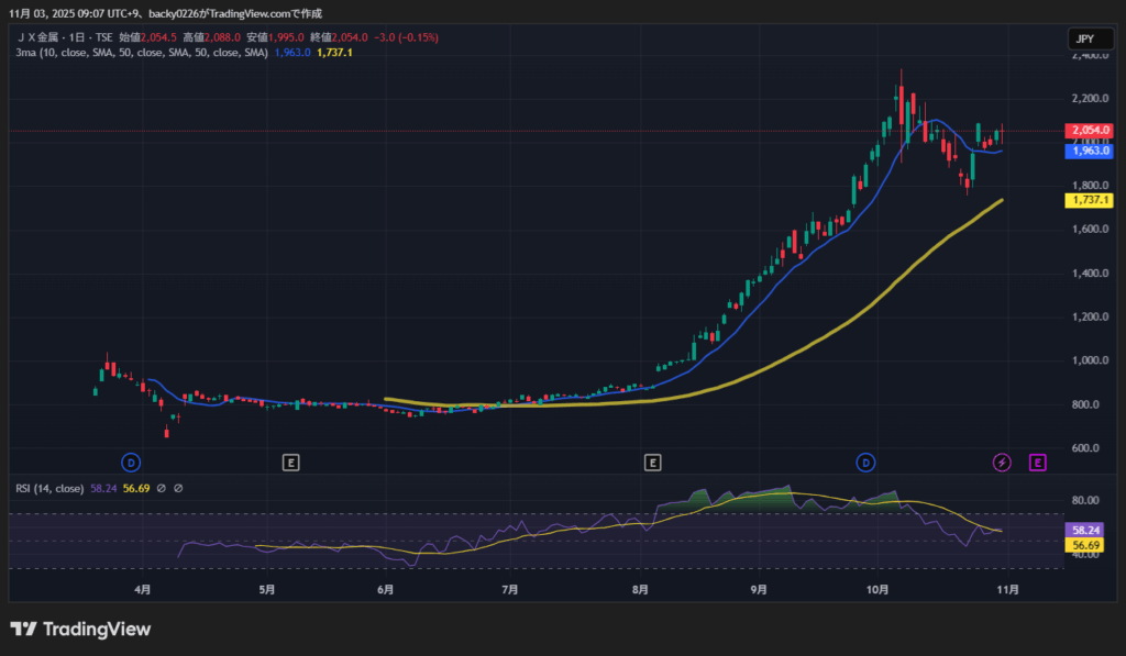 10月のJX金属は、ダイナミックな値動きを見せながらも、最終的には2,050円前後で着地。