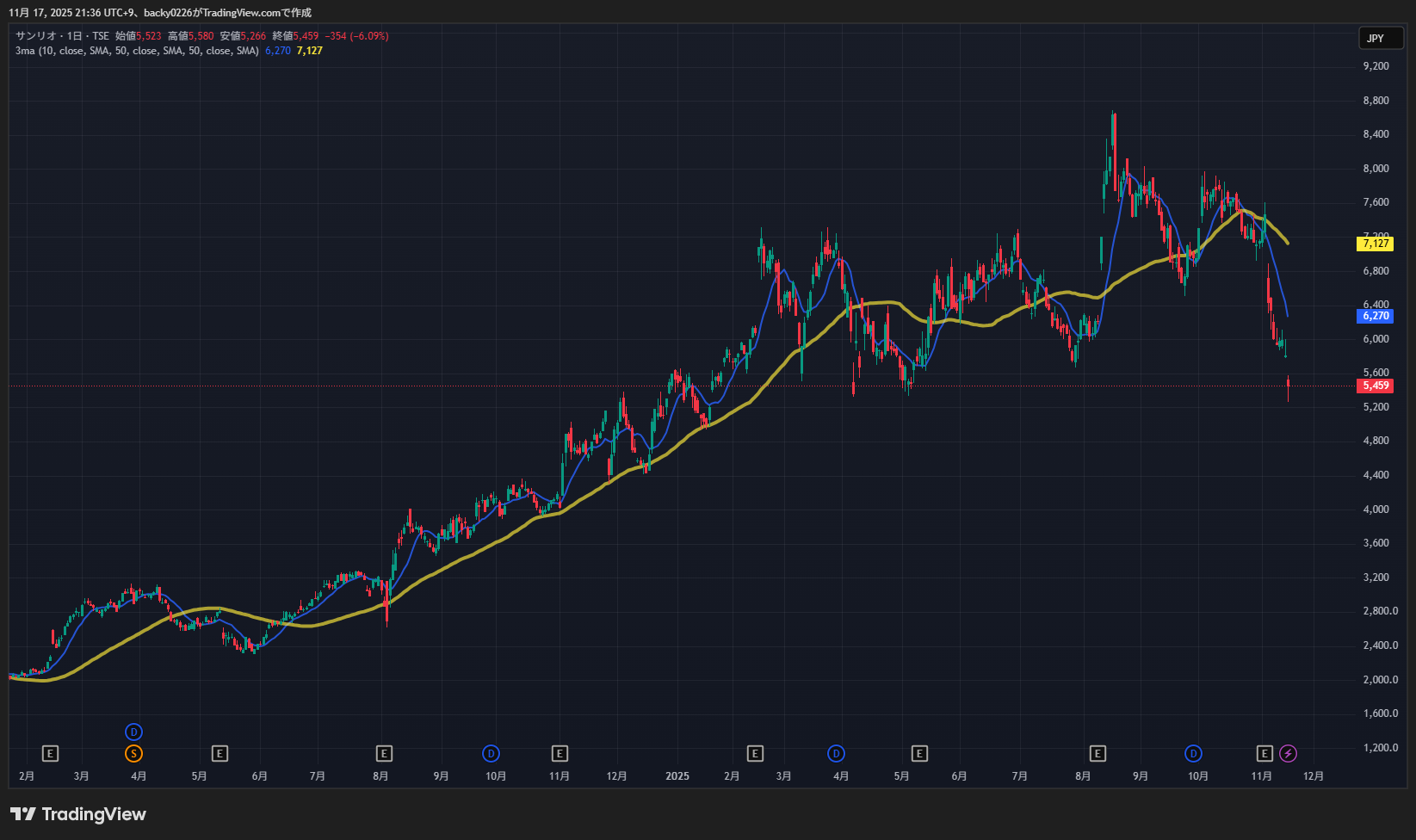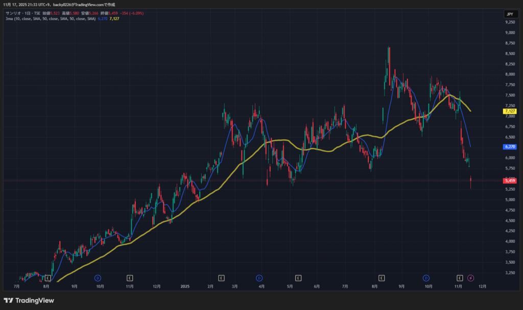 そういう“中期的なリスク”を嫌気して、サンリオにも売りが飛んでいる、という感じですね。