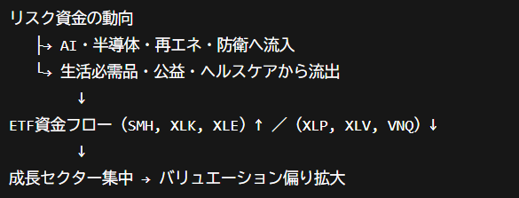 ETFのフローで見ても、SMH(半導体)・XLK(テック)・XLE(エネルギー)に買いが集中してて、逆に**XLV(ヘルスケア)・XLP(生活必需品)**は資金流出傾向です。」