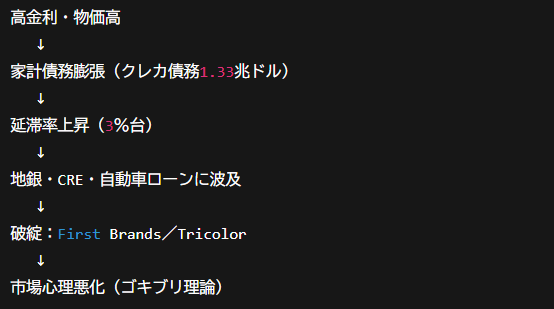 事実:9月〜10月に自動車部品のFirst Brands(Ch.11)サブプライム自動車のTricolor(Ch.7)が破綻。Zions/Western Allianceなど地銀は不良債権・不正融資開示で急落。Jefferiesなどのエクスポージャーも話題。