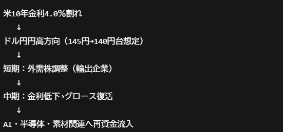 ・ベースケース(約半分の確率):物価鈍化+政策緩和期待+AI実需で安定拡大。長金3.8〜4.2%、株は上昇(期待)。