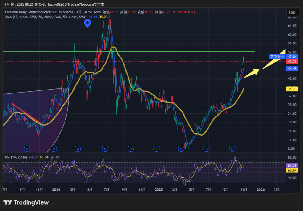 - リスク管理:SOXLはレバ3倍。ギャップダウンや日中急落が“日常”。ポジションは時間分散・価格分散、LC(損切り)ラインは41.5~42に設定しておくと戦いやすい。