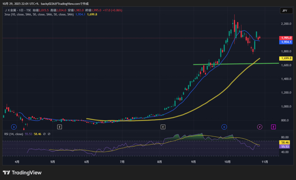 - その後も小幅に下げながらも、10月29日時点で1,995円(+0.86%)と堅調維持。