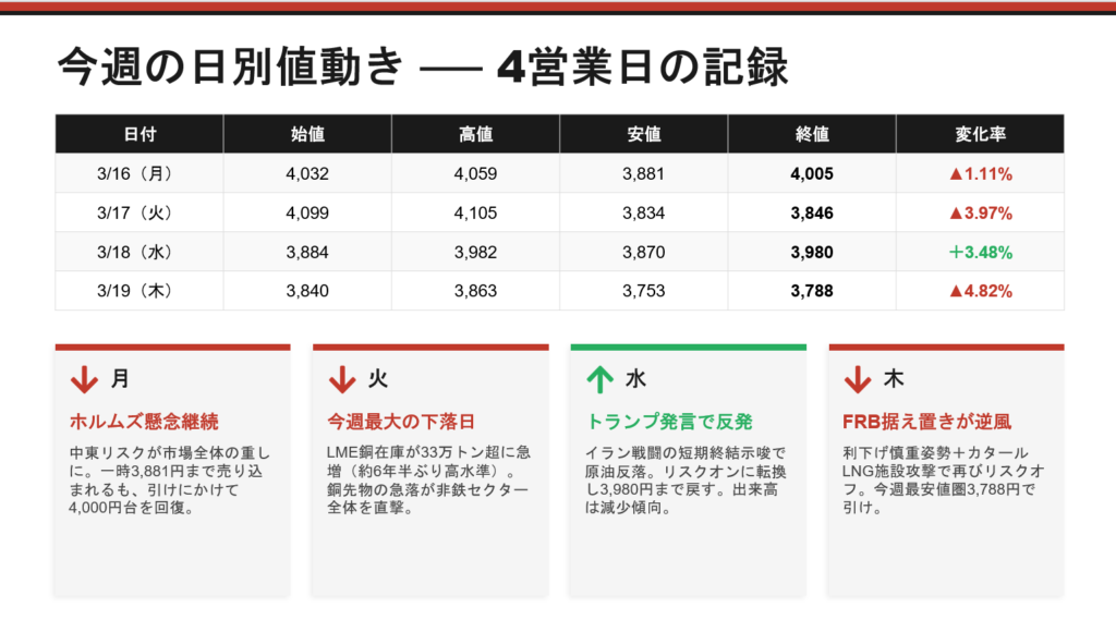 この日が今週最大の下落日です。寄り付きは強く4,100円台をつけたものの、その後は一方的な売り展開に。銅先物がポンドあたり5.7ドルを下回り、LMEの銅在庫が急増して約6年半ぶりの高水準に達したことが報じられ、非鉄金属セクター全体に売りが広がりました。中国の銅消費の減速やホルムズ海峡情勢を受けた世界経済の減速懸念も重なり、JX金属にもダイレクトに影響しました。