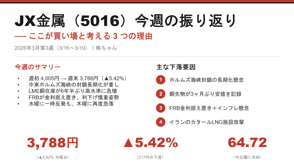 今週のJX金属は、ホルムズ海峡封鎖・銅在庫急増・FRBの利下げ見送りという「三重苦」に直面し、週間で5%超の下落となりました。