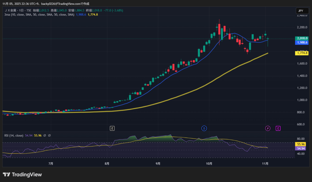 今日はJX金属が場中で一時10%近くドスンと落ちて、SNSでもざわついてましたね。終値は2,018円付近。前日比で約-3.7%と大きめの下げです。