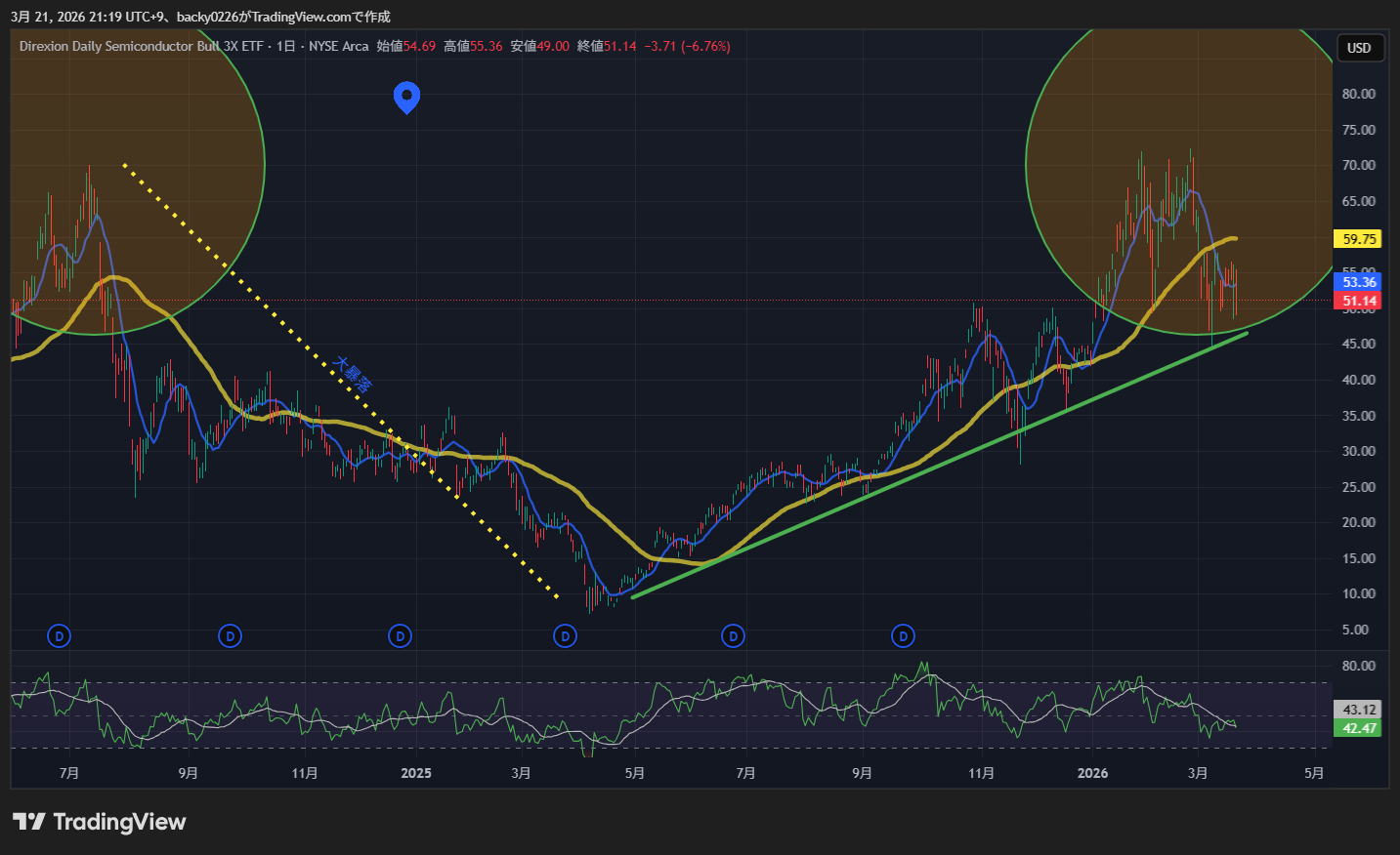 SOXLは2月25日につけた52週高値の72.36ドルから、3月に入って大きく調整。今週の開始時点ですでに高値から約25%の下落位置にありました。