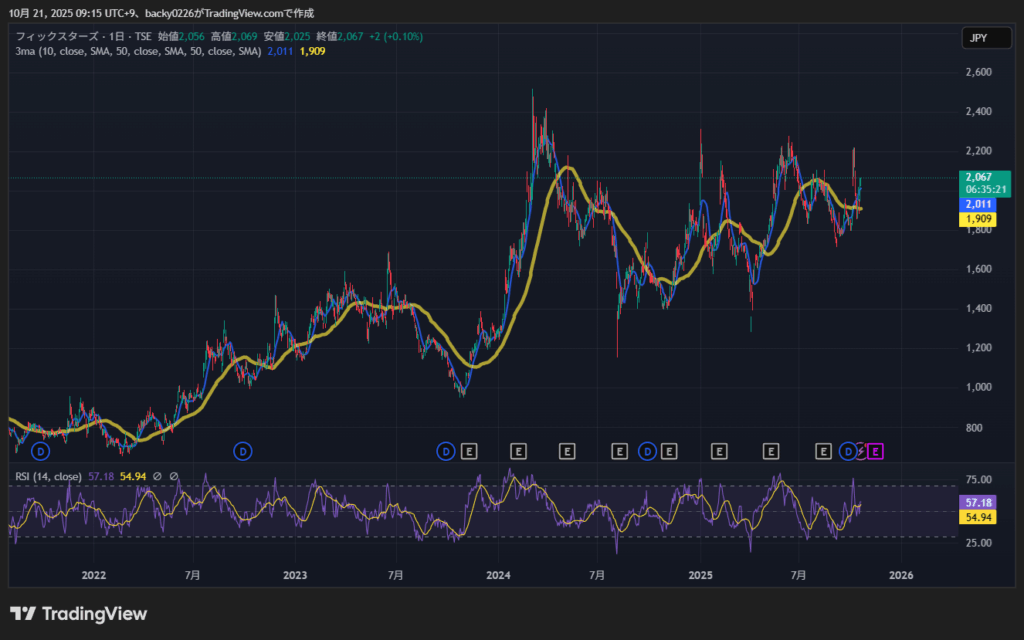 50日移動平均線(2,011円)と200日線(1,909円)を上抜けており、