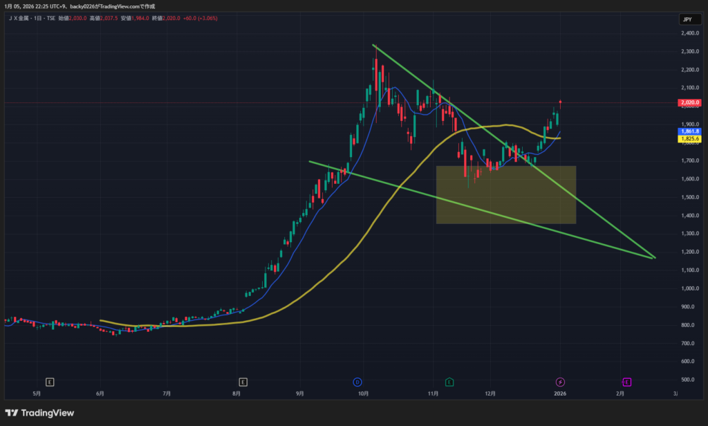 2026年1月8日時点のJX金属の株価は2,098円(前日比▲1.78%)。直近では一時2,200円台まで上昇したものの、足元では短期的な調整局面に入っています。ただし、この下落はトレンド転換というよりも、上昇トレンド中の健全な押し目と捉えるのが妥当でしょう。... -