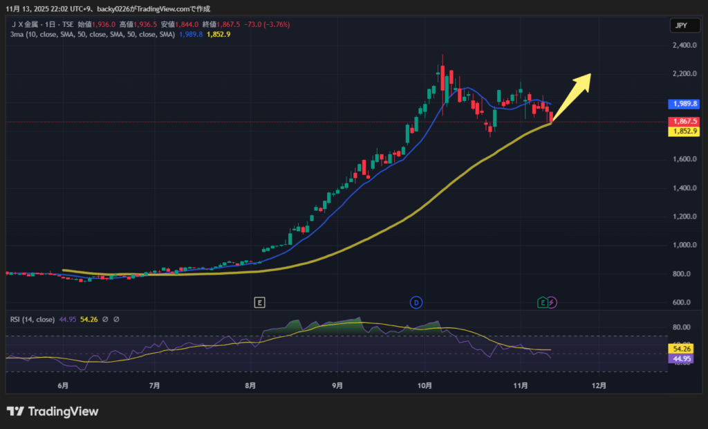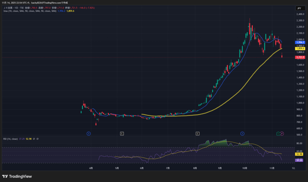 1.今のJX金属、チャートは「急騰後のガス抜き」局面 まず足元の値動きから。 11/13 終値:1,867.5円(前日比 -3.76%) 直近高値は2,300円台まであったところから、じわじわと調整中 チャート上では 青い線:10日移動平均線を割り込んで下向き 黄色い線:... -