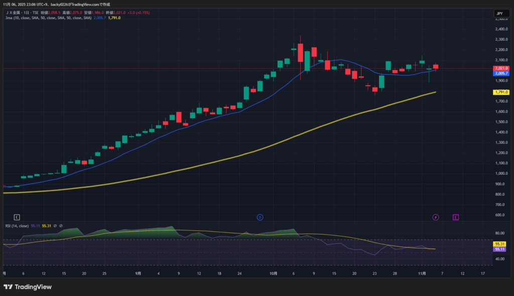 2025年11月5日更新 どうも、株ちゃんです。JX金属が今日は小幅プラス(+0.15%)の2,021円で引けました。前日の急落からなんとか落ち着きを取り戻した感じですね。「やっぱりもう上がらないのかな…?」と思う人もいると思いますが、実はまだトレンドの芽は... -