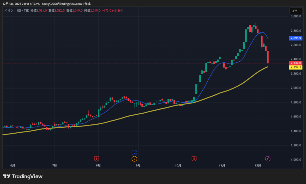 どうもこんにちは、株ちゃんです。いや〜イオンの株価、まじですか…という下げ方ですね。今回は、直近の急落を「なぜ起きたのか」「チャートでは何が起きているのか」「今後どこを見るべきか」を、初心者の方にもわかりやすく噛み砕いて解説します。 結論... -