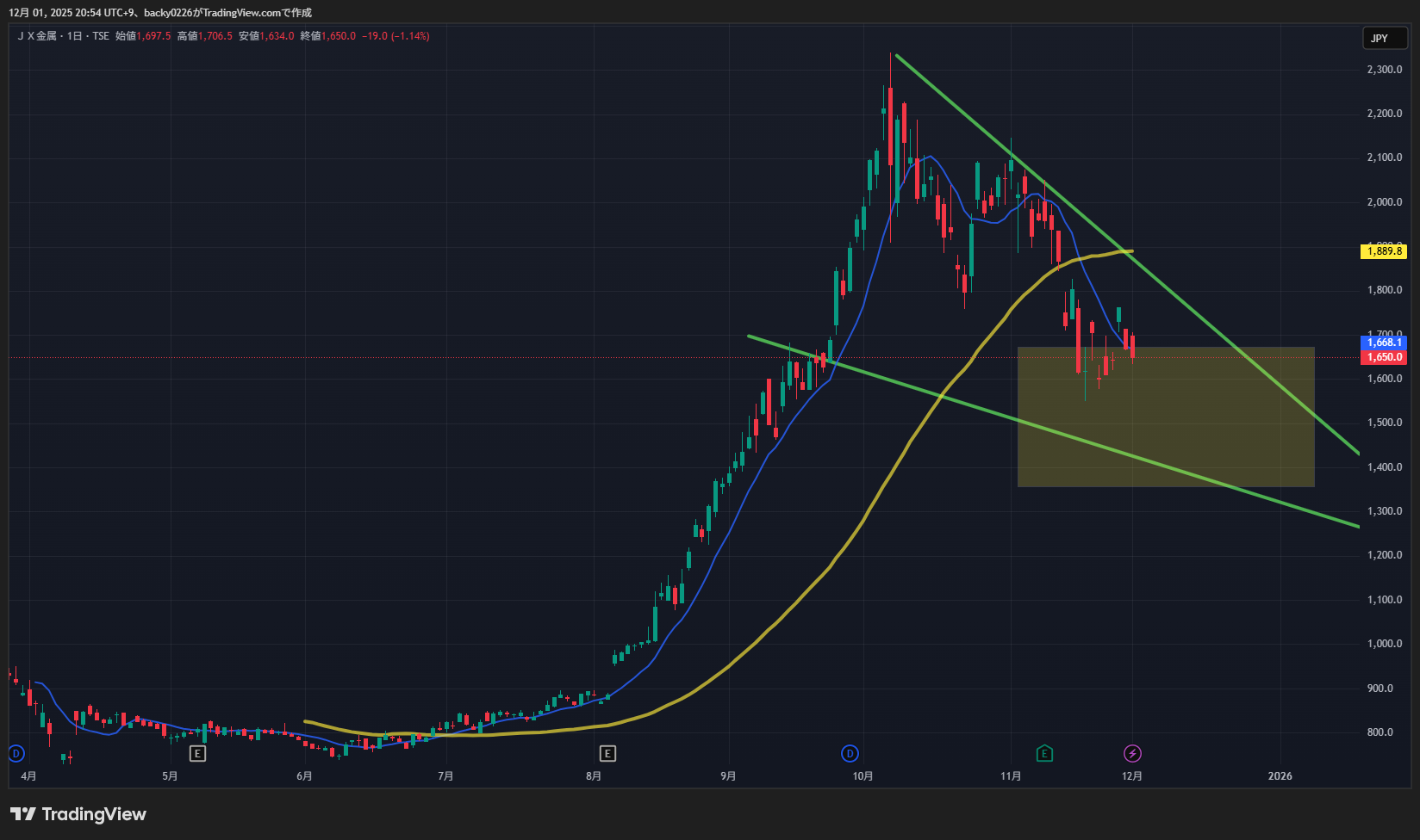 • 10月高値2,300円 → 下降トレンド継続