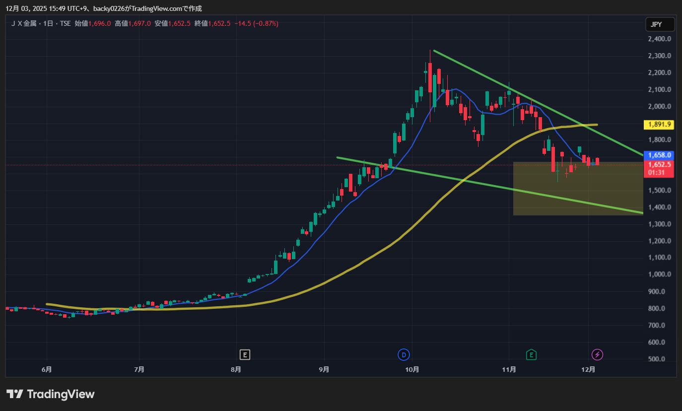 👉 JX金属は「本格調整中」かつ「三角持ち合い下抜けリスク」が高まる局面です。