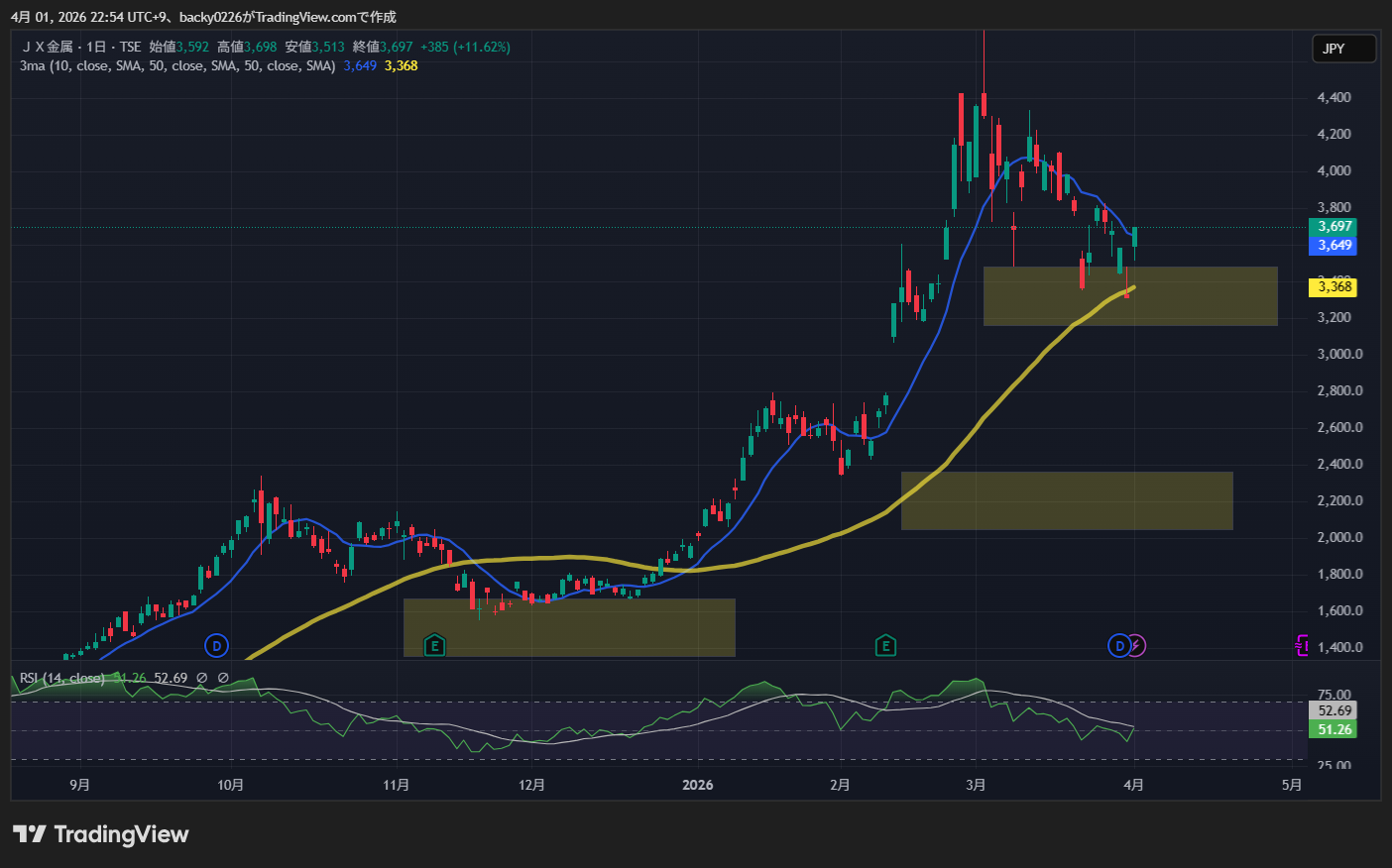 短期:50SMA(3,368円)がサポートとして機能するか確認。割らなければ4,000円トライの流れ。割れたら3,200円台で仕切り直し。