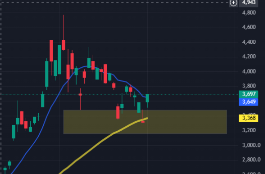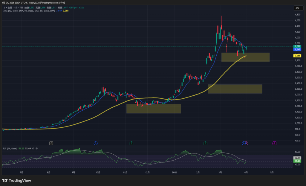 チャート上のレクタングル(黄色の四角)で示された3,200〜3,400円の「溜め場」を今日突き抜けました。このゾーンが今後サポートとして機能するかが、明日以降の最初の注目点です。次の意識される価格帯は3,800〜4,000円ゾーンです。