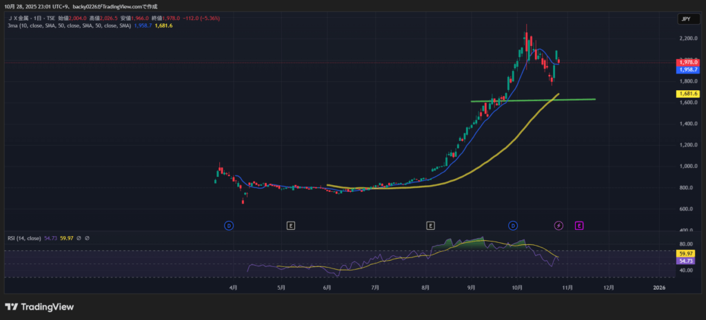 JX金属(5016)は、9月以降のAI関連・レアメタル関連テーマによる上昇トレンドが一服し、10月後半に調整局面へ移行しています。