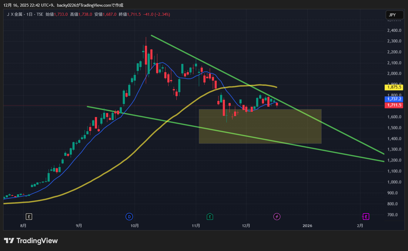 JX金属は「中期は下落トレンドの中、短期は1,650〜1,780円のボックス相場」。
