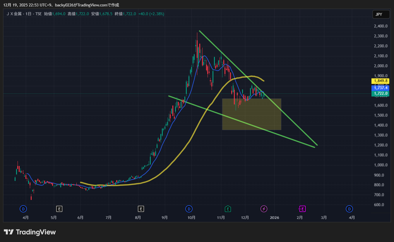 今回は JX金属(5713) の直近チャートをもとに、テクニカル・需給・日銀利上げの影響をまとめて、今後の見通しを初心者向けに噛み砕いて解説します。