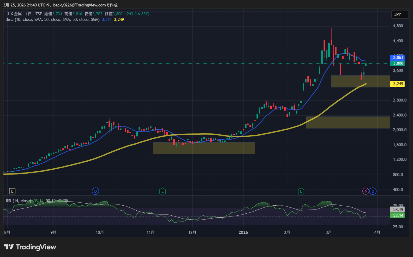 買い場: 3,200〜3,400円(50日SMA付近)での打診買い。ここが最も現実的なエントリーポイント