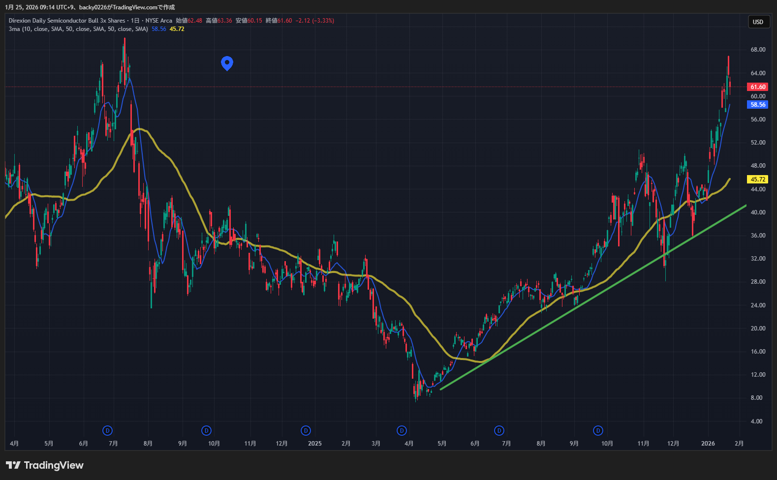 • SOXLは2025年に大きく上昇し、2025年終盤〜2026年初時点でも堅調な動き。