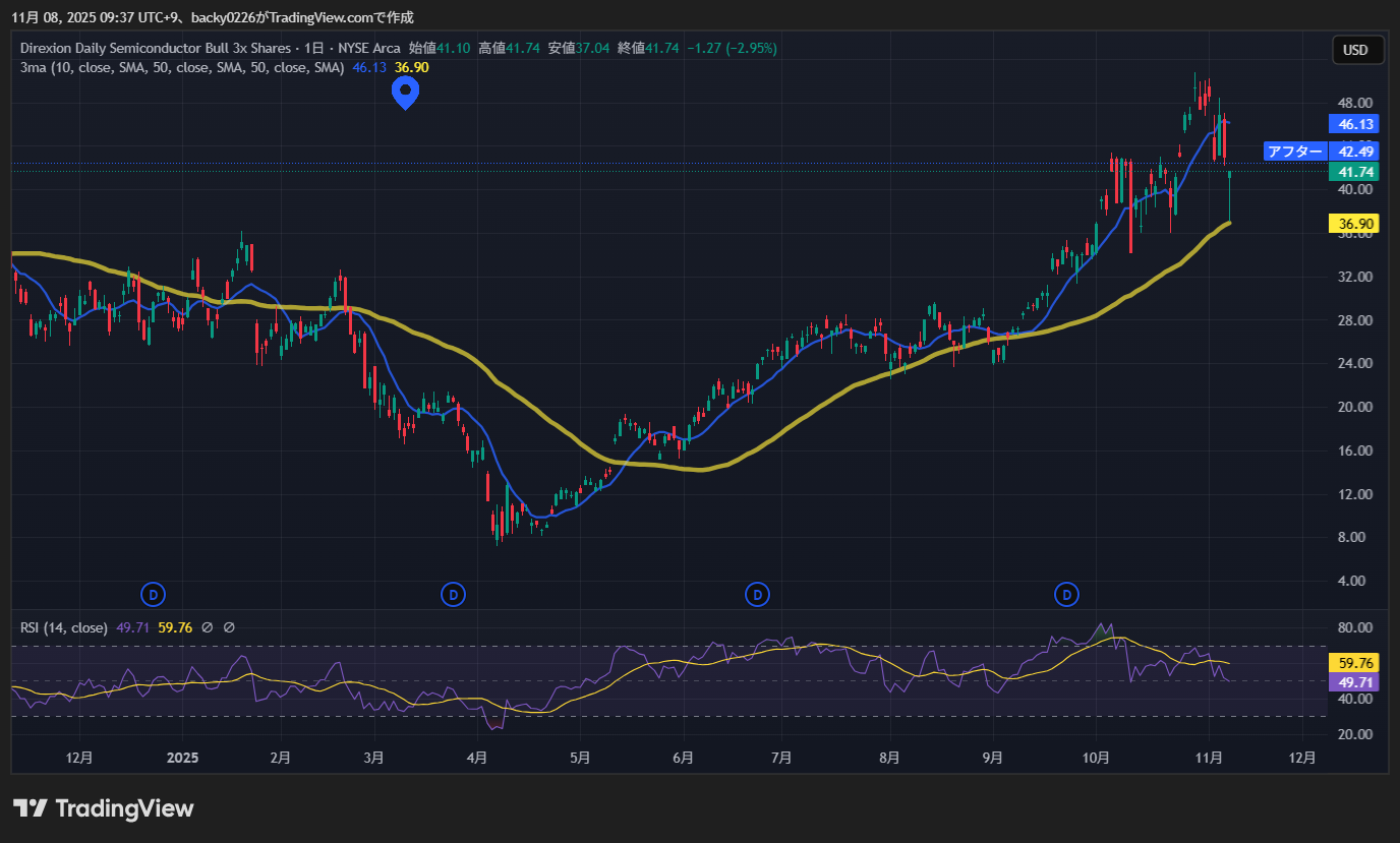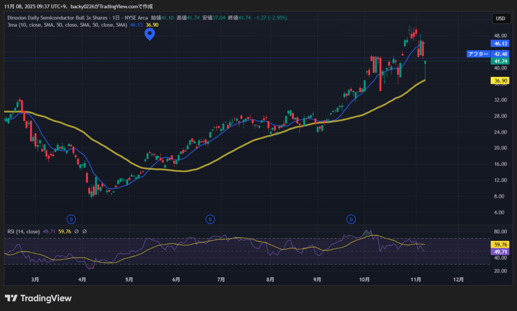 ここ数か月、AI特需(データセンター投資、HBM、GPUなど)を背景に、半導体セクターは期待先行で買われすぎてきました。10月後半〜11月入りで決算・マクロが出始めると、「設備投資は常に右肩上がりではない」「PC/スマホ/EVは回復初期」「在庫調整の尾」など現実確認モードにシフト。ハイβのAI関連で利益確定が進み、SOXLも11/4にかけて一時−11%と振れ幅が大きくなったのはこの延長線上です。
