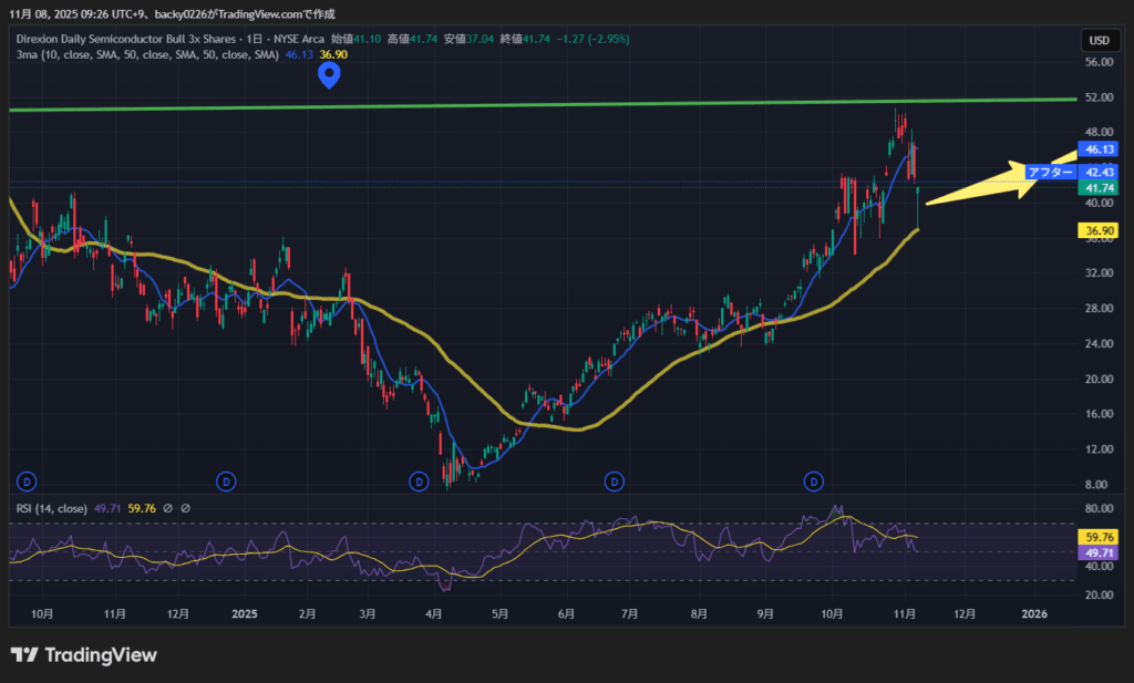 SOXLは個人も機関も触る代表的レバETF。日々のリバランス・ショートの買い戻し・需給の偏りで、“売られすぎ→踏み上げ”の反発が太くなりがち。11月前半は42〜47ドル帯の上下にザラバが荒れやすいぶん、出来高を伴う節目超えで一気に50台をトライするシナリオが残ります(※“日々減価”の性質上、ヨコヨコの長期保有は摩耗する点だけは要警戒)。