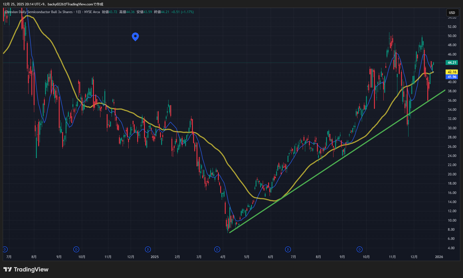 SOXLは12月下旬時点で44ドル前後。11月に50ドル台まで急伸した後、12月は40~48ドルの高ボラティリティな調整局面が続いています。
